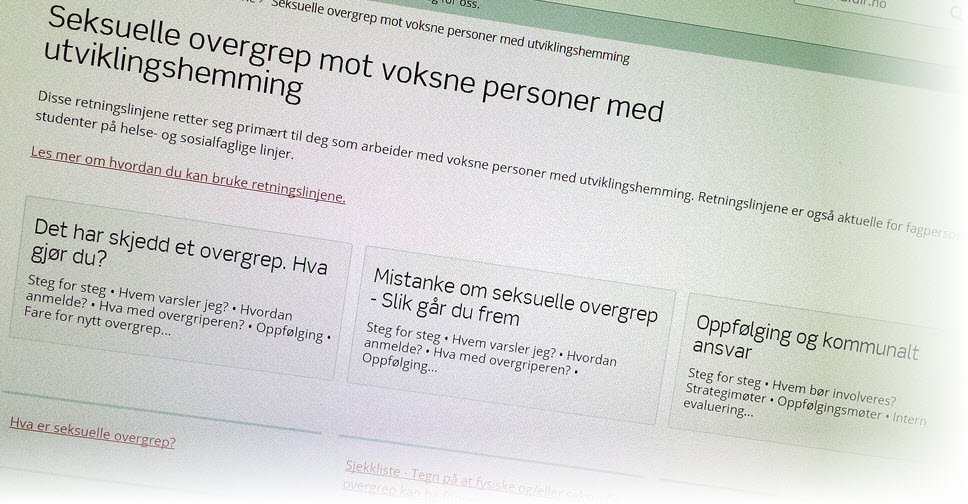 Utviklingshemmede løper større risiko for å bli utsatt for overgrep enn for befolkningen for øvrig, og få overgrepssaker blir anmeldt. På nettsiden Vernmotovergrep.no finnes nå kunnskap og retningslinjer. Men de må også tas i bruk, minner seniorrådgiver John-Ingvard Kristiansen og politioverbetjent Rolf A. Sætre om, og her kan vernepleierutdanningene spille en viktig rolle! (mer…)