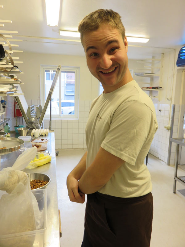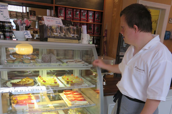 – Det er fint å jobbe på Erlandsens og jeg trives veldig godt. Synes det er fint å eie og drive kafeen sammen med de andre. Jeg liker best å jobbe i bakeriet og i butikken, men bakeriet er aller best. Det er gøy å lage kaker. Jeg har andre oppgaver også – etter stengetid må jeg rydde og vaske toalettene og sette på plass nye tørkeruller. Jeg er også strykesjef slik at det blir nystrøkne duker på bordene. . I bakeriet kverner jeg mandler og lager deiger. Av deigene lager vi budapestkake og suksesskake. Vi lager også andre kaker, som ostekake. På fredager har vi fredagskos og da spiser vi kake. Kyllingsalat er også veldig godt. Vi lager også veldig god glutenfri muffins med sjokolade i. Før var kafeen åpen til kl 4, men nå stenger vi klokken 3. Etter stengetid må vi rydde og vaske og skifte tørkeruller og poser på toalettene. Jeg starter dagen med å støvsuge litt i resturanten.