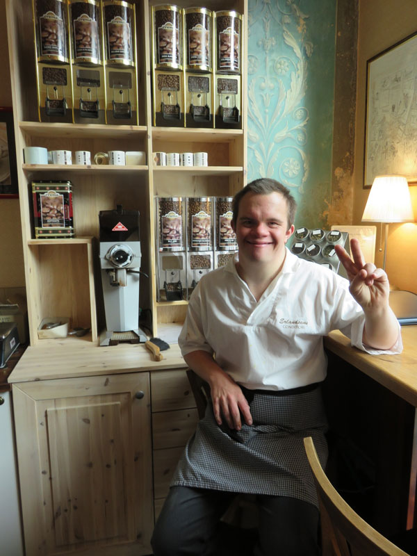 – Jeg vil helst jobbe hver lørdag jeg og jeg skal jobbe til lørdag. Jeg er ansvarlig for kaffekokingen. Ellers er mine oppgaver å rydde av og vaske bord og ta oppvasken, men vi har oppvaskmaskin da. Jeg er også veldig glad i å være i bakeriet – det er aller best. Jeg er også kaffesjef, så det er min jobb å passe på at det alltid er kaffe på kanna. Hver onsdag kommer det også varer til kafeen. Da må alle hjelpe til å bære varene inn og sette dem på riktig plass i hyllene på lageret og på kjølerommet. Jeg ordner all posten og ser på regninger. Jeg har gått på pengekurs slik at jeg har lært hva pengene er verdt. Gleder meg til fredagskosen – da har vi enten is eller kake. Det jeg liker ved å være her er at jeg treffer mange folk og det er hyggelig å snakke med dem. Når det kommer folk til kafeen sier jeg velkommen til Erlandsens. Det er også en gammel kjeller her og der er det mye rart. I kjelleren er all brusen så jeg bærer brus og tomflasker opp og ned. Vi har alle sammen vært på kurs for å lære å lage kaffe og te. Det var i Sandefjord. Da lærte jeg å lage kaffe med kanel, melk og fløte. Alle har gått på baristakurs, men vi har en helautomatisk baristamaskin som vi bruker mest. Det er bare Malin som klarer å bruke den andre. Jeg har vært i Oslo og hilst på Siv Jensen på kontoret hennes på Stortinget. Jeg fikk brev fra henne forrige uke – da sa hun «takk for besøket!». Vi hadde demonstrasjon foran Stortinget og fikk lov til å komme inn.